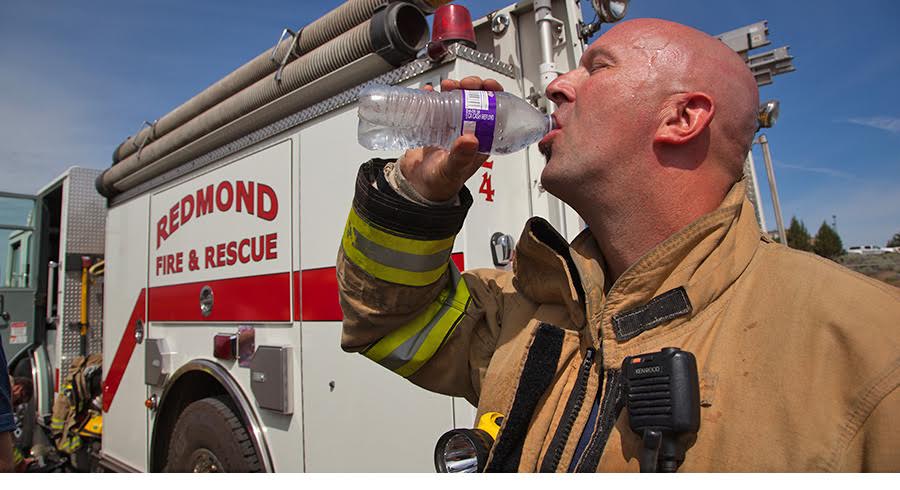 Η ενυδάτωση είναι ένα κρίσιμο στοιχείο για την πρόληψη της θερμότητας που σχετίζονται με ασθένειες θερμοπληξίας. Ενθαρρύνετε το προσωπικό να μην περιμένει να αισθανθεί συμπτώματα θερμικής καταπόνησης για να αρχίσει την ενυδάτωση, αλλά να ενυδατώνονται καθόλη την διάρκεια του συμβάντος ακόμα και αν δεν υπάρχει πυρκαγιά αλλά ακραίες θερμοκρασίες.