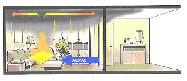 - Όταν δημιουργείται άνοιγμα, ο ατμοσφαιρικός αέρας εισέρχεται στο διαμέρισμα ταχύτατα, ενώ ο καπνός εξέρχεται υπό μεγάλη πίεση και στροβιλισμούς.