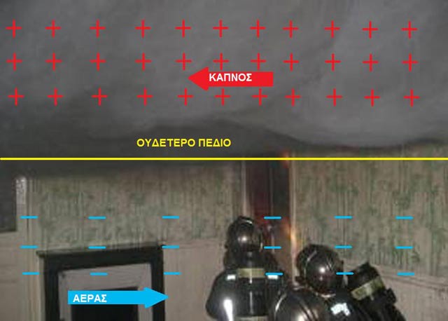 - η θερμότητα που προέρχεται από το στρώμα καπνού είναι έντονη και υποχρεώνει το πυροσβεστικό προσωπικό να γονατίσει σε μία ζώνη όπου ο κατευθυνόμενος στην φωτιά ψυχρότερος αέρας φαίνεται να αποτελεί «μόνωση» και δίνει την ψευδαίσθηση της ασφάλειας
