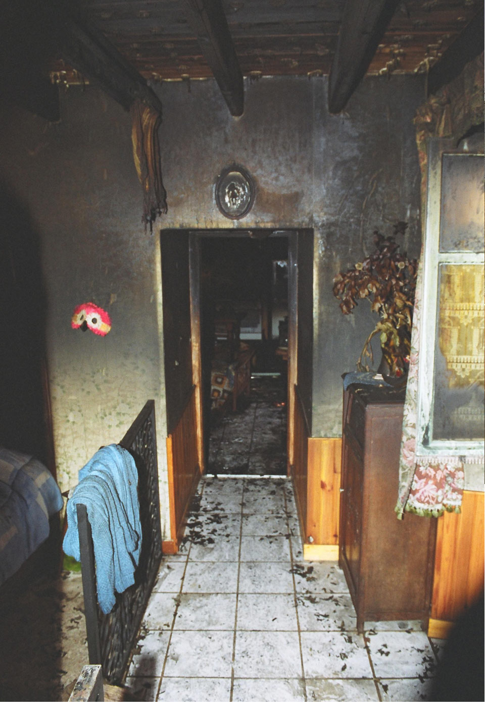 Φτάνοντας στην είσοδο της οικίας, ο ιδιοκτήτης τους υποδέχθηκε και οδήγησε τους δύο πρώτους πυροσβέστες που έφεραν πλήρη ατομικό προστατευτικό εξοπλισμό και αναπνευστικές συσκευές στον χώρο του συμβάντος. Από την είσοδο του σπιτιού πέρασαν πρώτα από έναν μικρό διάδρομο και το υπνοδωμάτιο (εικόνα 2), στο οποίο καθόταν η σύζυγος του ιδιοκτήτη. Εκείνη την στιγμή δεν υπήρχε κανένα ίχνος καπνού η φωτιάς στους χώρους αυτούς. Αμέσως μετά έφτασαν στην σαλοτραπεζαρία. οπου εκεί υπήρχε ένα μικρό και «ελαφρύ» στρώμα ανοιχτόχρωμού καπνού, το οποίο ίσα-ίσα μισοκάλυπτε τις ξύλινες δοκούς που στήριζαν το πάτωμα του υπερκείμενου ορόφου.