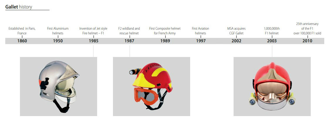 Ιστορικά η Gallet εφηύρε το αεροδυναμικό στυλ των κρανών για πυροσβέστες. Ξεκίνησε με την εγκατάσταση της στην Γαλλία το 1860, το πρώτο κράνος αλουμινίου παρήχθη το 1950. Η εφεύρεσή της για τα αεροδυναμικά κράνη προέκυψε το 1985. Το 1987 λάνσαρε το κράνος διάσωσης και δασοπυρόσβεσης και συνέχισε με άλλα κράνη για την αεροπλοΐα και τον Γαλλικό στρατό κατά τα έτη 1989-1997.