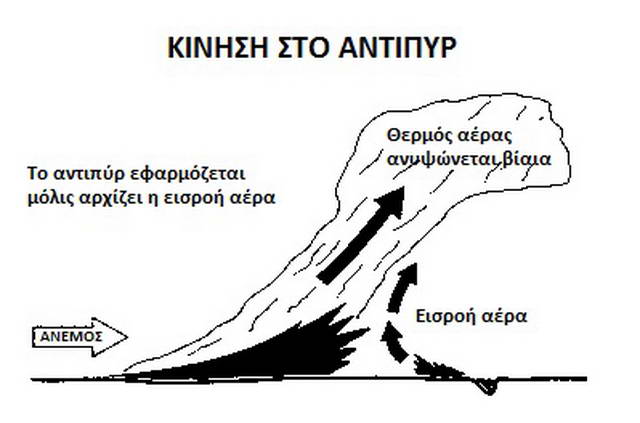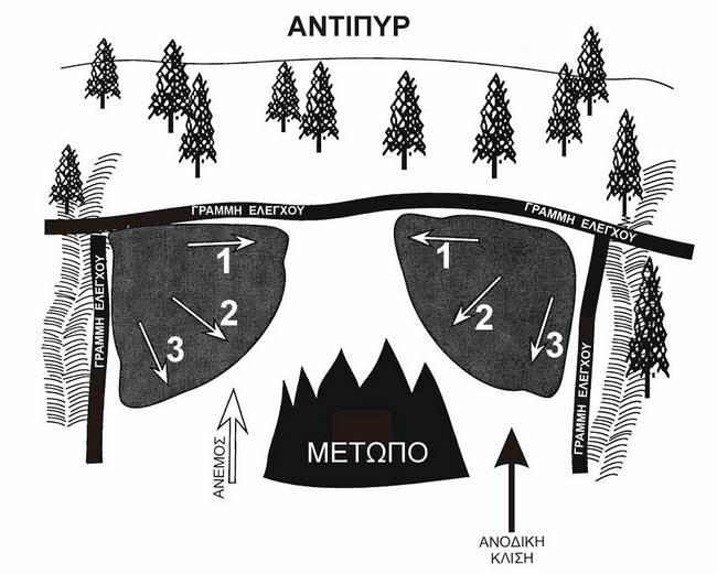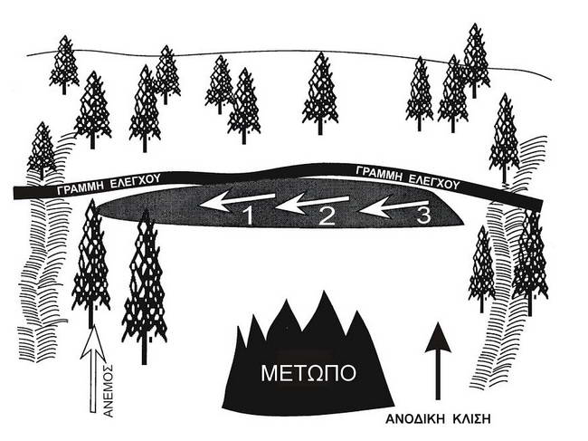 Το ρεύμα αέρα που δημιουργείται προς την πυρκαγιά χρησιμοποιείται για τον έλεγχο της φωτιάς (σχέδιο 3).
