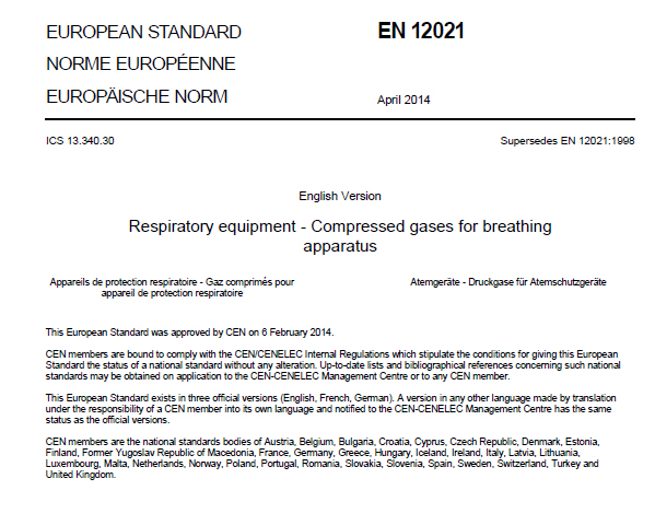 Αφού λοιπόν ξεκαθαρίσαμε παραπάνω κάποιους μύθους γύρω από τον αέρα και τις φιάλες, ας δούμε λοιπόν ποια είναι η νομοθεσία στην Ευρώπη αναφορικά με την ποιότητά του αέρα. Η ποιότητα του αναπνευστικού αέρα αναφέρεται στο Ευρωπαϊκό Πρότυπο EN 12021 όπου παρέχονται όλες οι πληροφορίες σχετικά με τα ασφαλή όρια. Η νομοθεσία αυτή ανανεώθηκε τον Ιούλιο του 2014 (η προηγούμενη ήταν το 1998) ΕΝ 12021/20142.  Μια από τις διαφοροποιήσεις που έγινε τον Ιούλιο του 2014 ήταν ότι το ανώτατο επιτρεπόμενο όριο τιμής για το μονοξείδιο του άνθρακα μειώθηκε από 15 ppm σε 5 ppm.