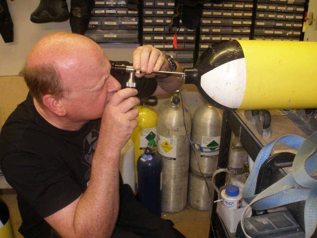 Ο τεχνικός κατά την διαδικασία ελέγχου εξετάζει διεξοδικά την φιάλη για εσωτερική διάβρωση ή κατάλοιπα ρυπαντών