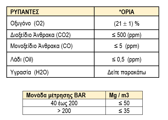 Σύμφωνα με τη Ευρωπαϊκή Νομοθεσία EN 12021, απαιτείται ο πεπιεσμένος αέρας που χρησιμοποιείται για αναπνευστικό εξοπλισμό να μην περιέχει τυχόν μολυσματικές ουσίες σε επιβλαβές επίπεδο που θα έχουν ως αποτέλεσμα την βλάβη της υγείας του τελικού χρήστη.  Οι δοκιμές για επιβλαβείς ουσίες πρέπει να διενεργούνται τουλάχιστον μία φορά κάθε 6 μήνες στην πηγή πλήρωσης (αεροσυμπιεστής). Προσωπικά θα πρότεινα ανά 6 μήνες και ένα δειγματοληπτικό έλεγχο στο 10% των φιαλών που αποθηκεύει η εταιρία, ο οργανισμός ή η εκάστοτε υπηρεσία. Στο Ηνωμένο Βασίλειο (UK) ο έλεγχος επιβάλλεται κάθε 3 μήνες.
