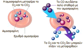 Το χαρακτηριστικό των δηλητηριάσεων από μονοξείδιο του άνθρακα είναι το έντονο κερασέρυθρο χρώμα που αποκτά το σώμα του θύματος και είναι εμφανέστατο στο πρόσωπό του. Με τον τρόπο αυτό εμποδίζεται η ανταλλαγή των αερίων στο επίπεδο των ιστών και γρήγορα εμφανίζεται υποξία. Αντίστοιχα, με την αιμοσφαιρίνη που μεταφέρει το οξυγόνο στους ιστούς, δρα και η μυοσφαιρίνη (myoglobin), η οποία μεταφέρει το οξυγόνο στα μυικά κύτταρα. Η μυοσφαιρίνη επίσης παρουσιάζει κατά περίπου 60 έως 70 φορές μεγαλύτερη συγγένεια προς το CO σε σχέση με το Ο2. Αν υπάρχει αυξημένη συγκέντρωση CO στην ατμόσφαιρα, τότε μεγάλο ποσοστό των ερυθρών αιμοσφαιρίων θα μεταφέρει CO αντί για το οξυγόνο που χρειάζονται όλοι οι ανθρώπινοι ιστοί για να λειτουργήσουν. Αυτό μπορεί να οδηγήσει σε βλάβη των ιστών και θάνατο.