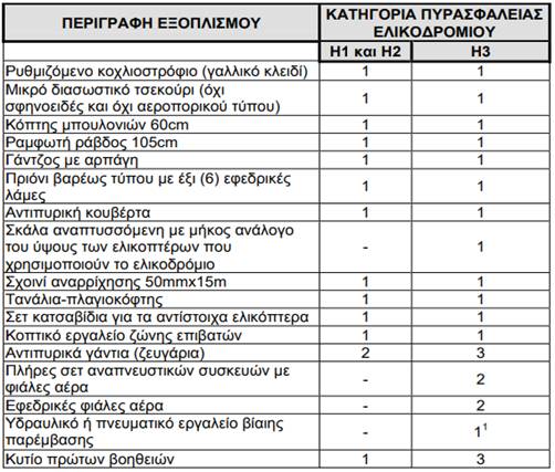Στον παρακάτω πίνακα, ορίζεται ο αναγκαίος διασωστικός εξοπλισμός που πρέπει να υπάρχει σε ένα ελικοδρόμιο ανάλογα με την κατηγορία του.