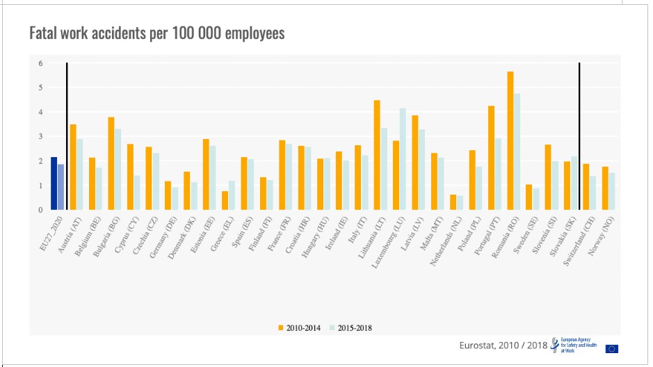 Θανατηφόρα εργατικά ατυχήματα ανά 100.000 εργαζόμενων στην Ε.Ε. Η Ελλάδα είναι από τις τρεις χώρες στις οποίες παρατηρείται αύξηση του ποσοστού κατά το διάστημα 2015-2018 σε σύγκριση με το αντίστοιχο της περιόδου 2010-2014. (πηγή OSHA)