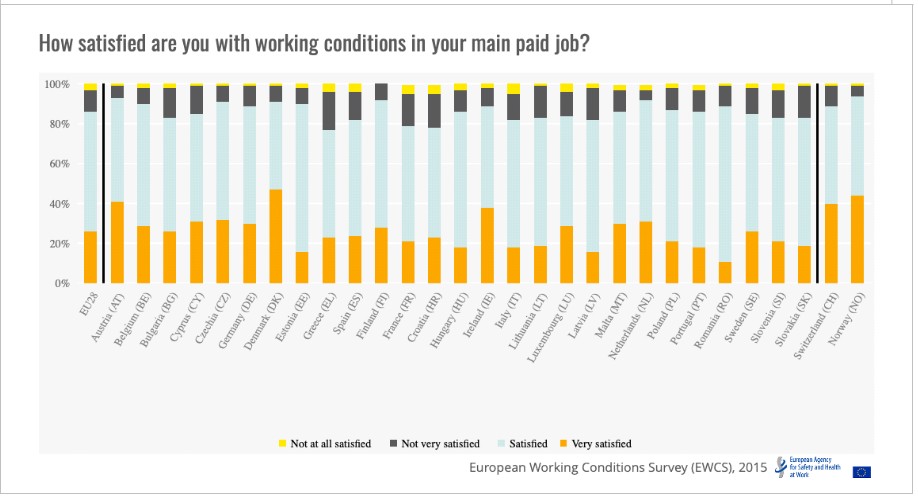 Ποσοστό ικανοποίησης από τις συνθήκες εργασίας ανά χώρα της Ε.Ε. (πηγή OSHA)