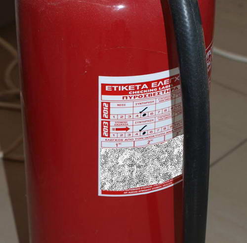 Ταυτόχρονα διαθέτει αυτοκόλλητη ετικέτα ελέγχου στο σώμα του με χαρακτηριστικά στοιχεία για την συντήρηση που έγινε, καθώς και την ημερομηνία του επομένου ελέγχου που πρέπει να γίνει. (δείτε φωτογραφία κάτω)