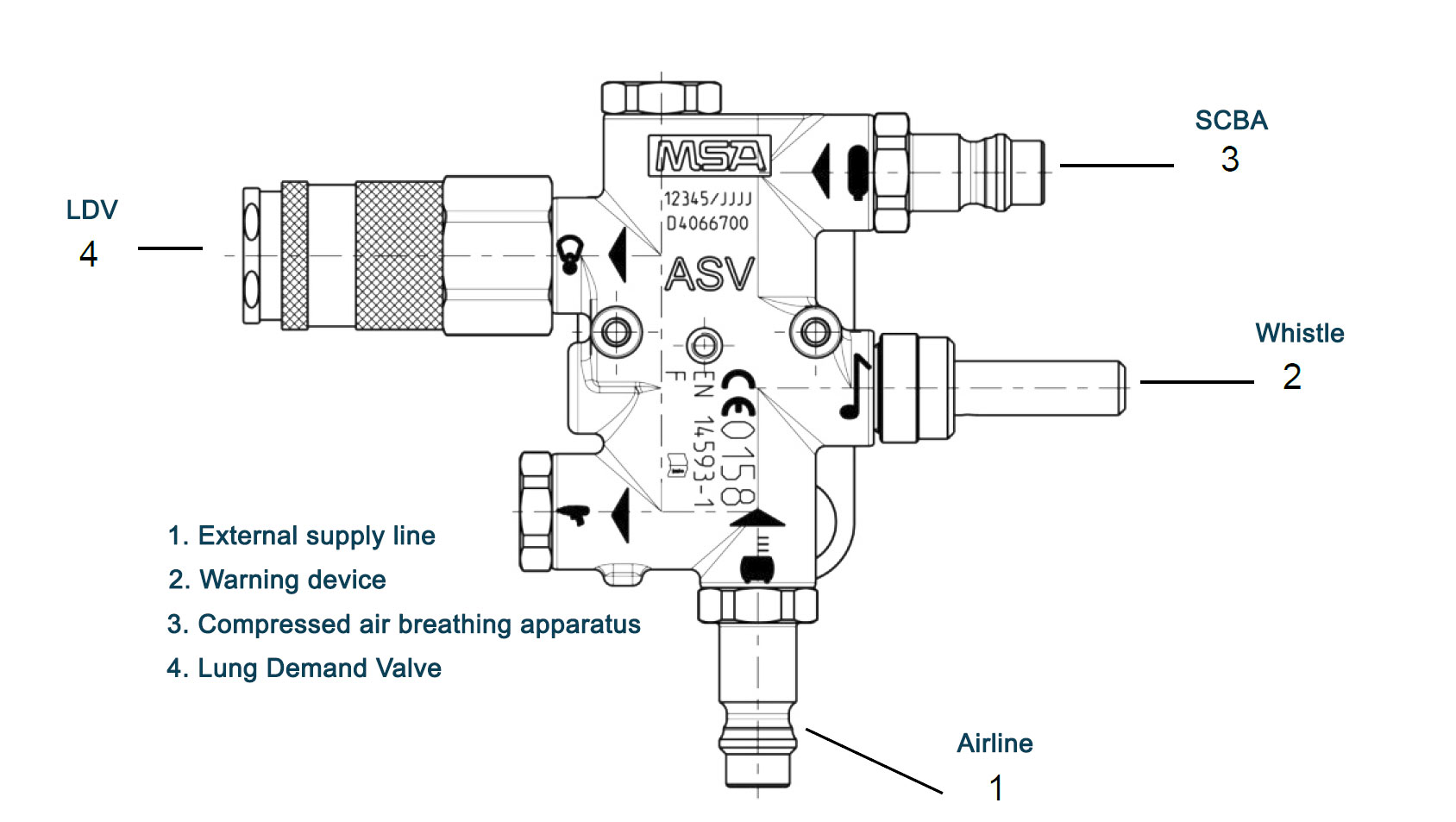 The ASV is typically mounted at the wearer’s waist and links three air pathways: