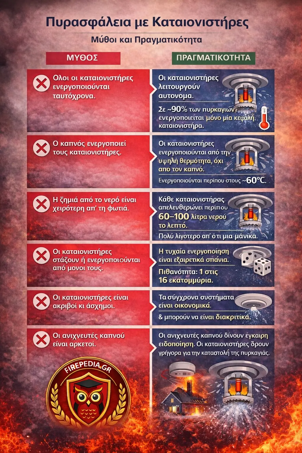 Σε αντίθεση με όσα βλέπουμε στις ταινίες, τα sprinklers δεν ενεργοποιούνται από τον καπνό, αλλά από τη θερμότητα.